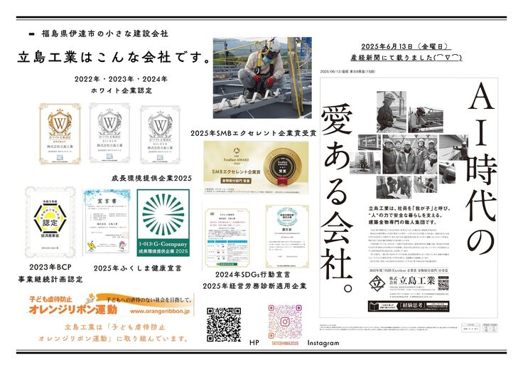 平成29年4月個人事業主 開業 令和元年11月1日 法人成り 2022年・23年・24年3年連続「ホワイト企業認定」取得 2023年BCP取得済み 2024年福島県伊達市初「SDGs行動宣言」福島信用金庫 2025年「健康事業所宣言」参加事業所認定 2025年SMBエクセレント企業賞受賞 2025年成長環境提供企業認証 2025年社労士診断認証制度経営労務診断適合企業 2025年子供虐待防止「オレンジリボン運動」加入 各現場内で、安全な労働環境をしているという事で表彰を頂いております。