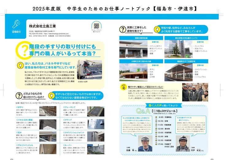 私たちは福島県伊達市にある、小さな建設会社です。 主に「金物取付工事」と呼ばれる、建物に必要な金属部品を取り付けるお仕事をしています。駅や学校、市役所など、みなさんの身近な場所を、より安全に・便利に仕上げるお手伝いをしています。