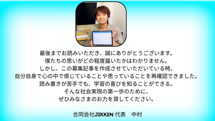 このアプリが広がれば、「読み書きが苦手でも、学びを諦めなくていい社会」が実現できます。