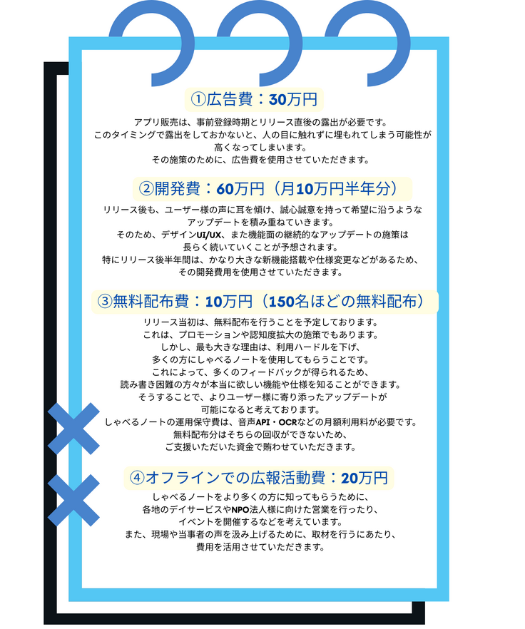 合同会社JIKKENが、学習障害に悩む学生向けに、AIを活用したノートアプリサービスを販売します。それに必要な開発費、サービス運用費、広告費、広報活動の一部に、今回集まった資金を利用させていただきます。