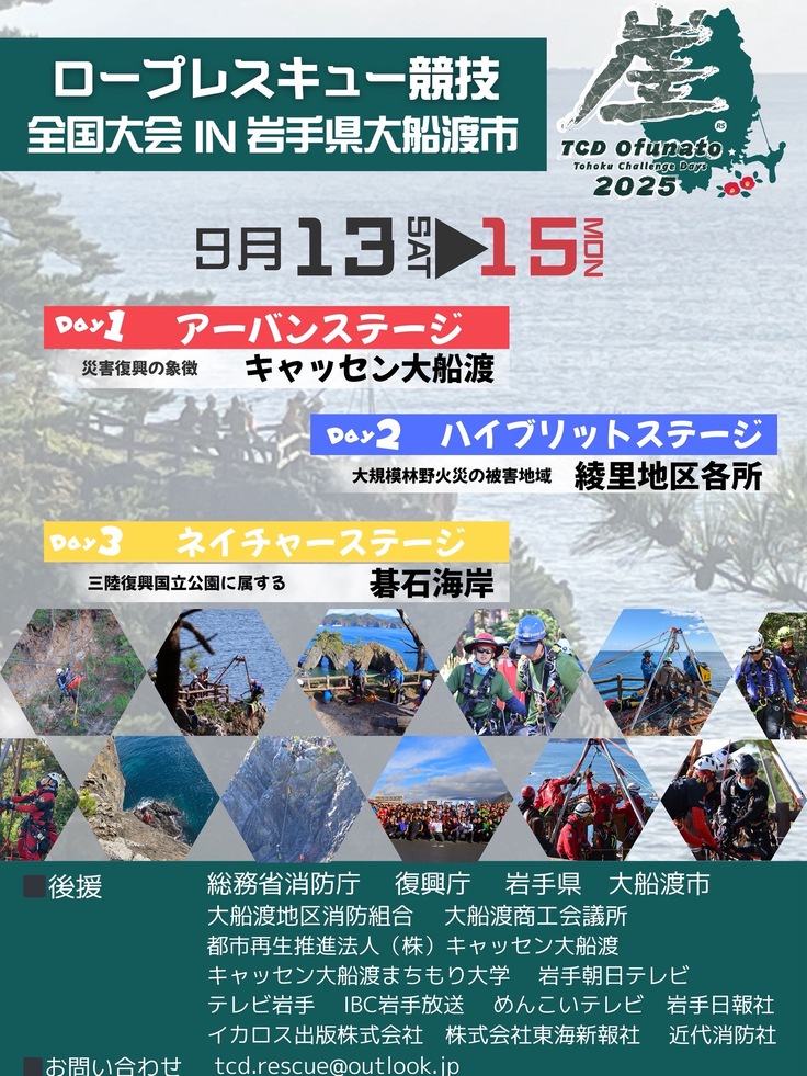 さて、『Tohoku Challenge Days2025 ロープレスキュー競技会in大船渡』の開催まで約1カ月となりました。全国から参加される消防士は休日を活用し訓練に励んでいます。競技会企画者である私たちも、安全に競技できるよう会場にて事前訓練しています。