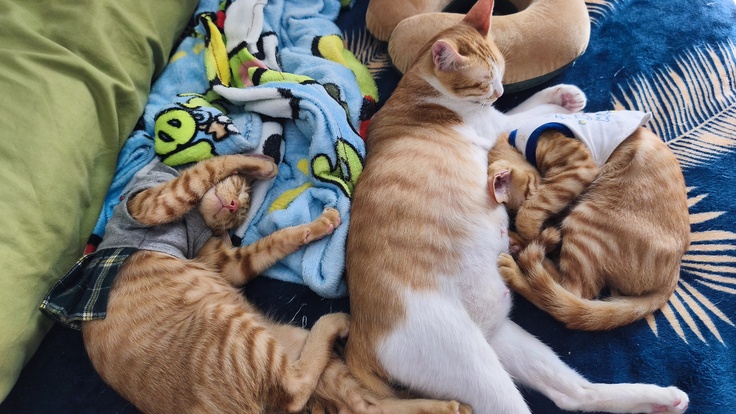 路上•市場で衰弱していた妊婦猫を保護し、安全な環境で出産・育児を支援。