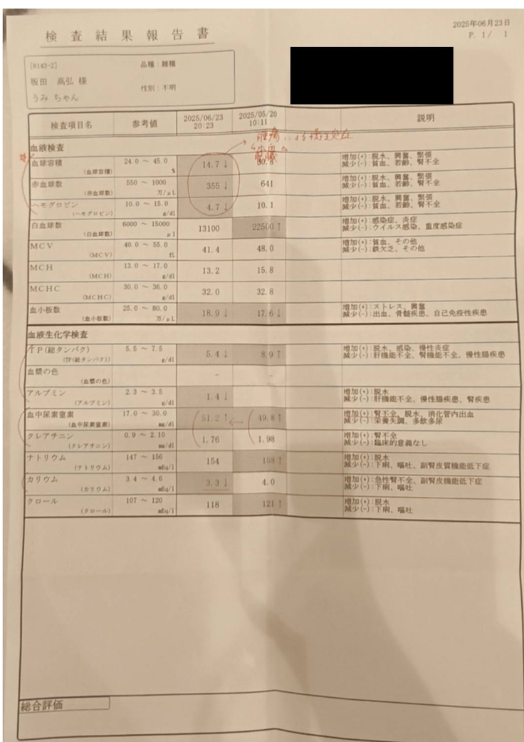 急に落ちすぎているので血液検査をして頂いたところ、重度の貧血状態との診断。