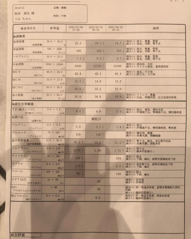 脱水気味だったので数値が上がっている可能性もありますので、こちらは要経過観察です。