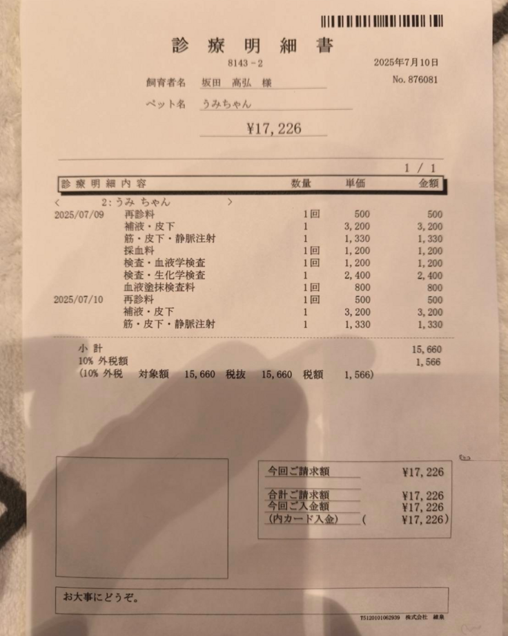 病院の領収書、昨日の分と纏めて本日精算したので2日分です。