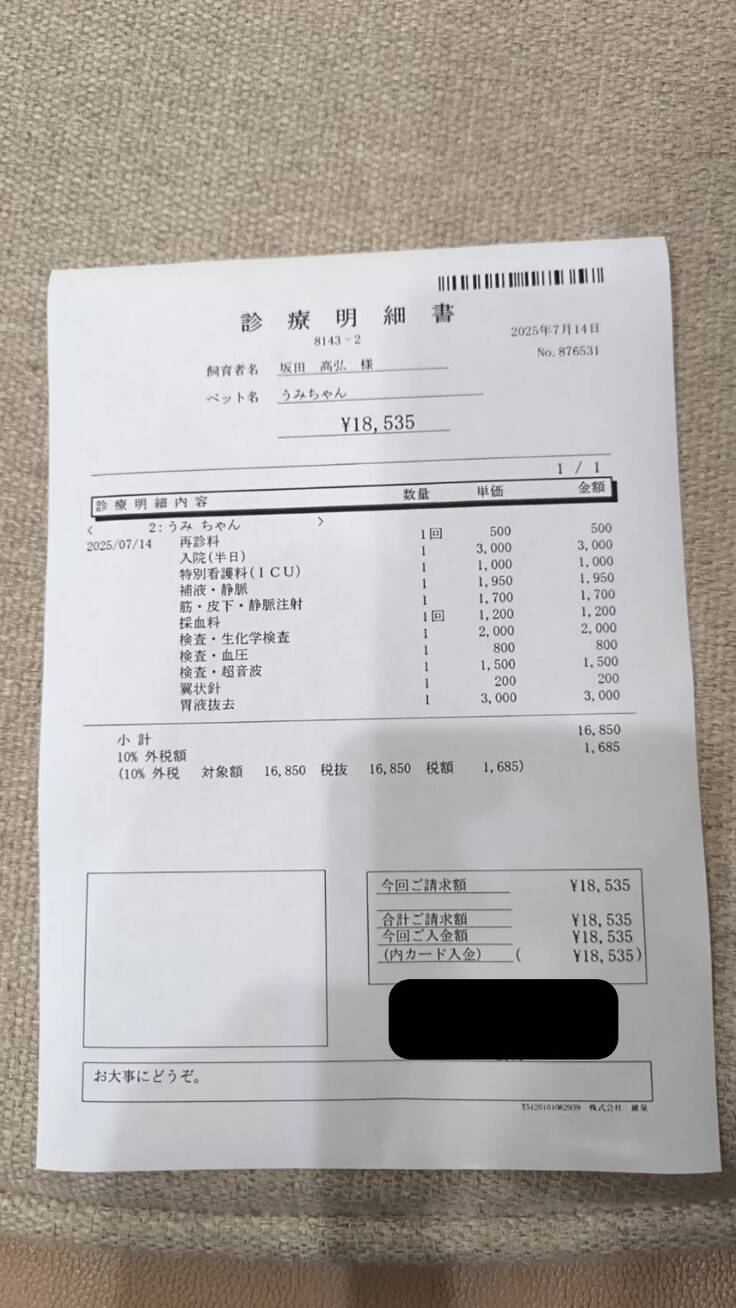 今日は一晩で水・ウェットフード合わせて10ml、2から3mlずつ少量頻回であげてもいいとのことです。
