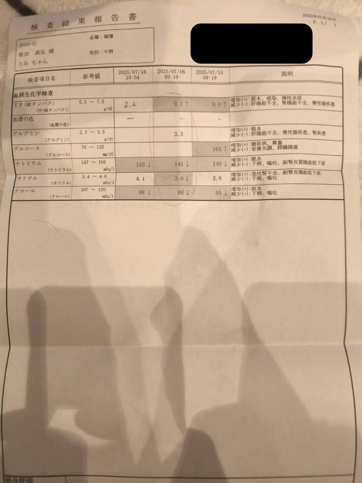 朝一はカリウムの数値が下がっていましたが、夜には点滴のおかげで基準値内です。