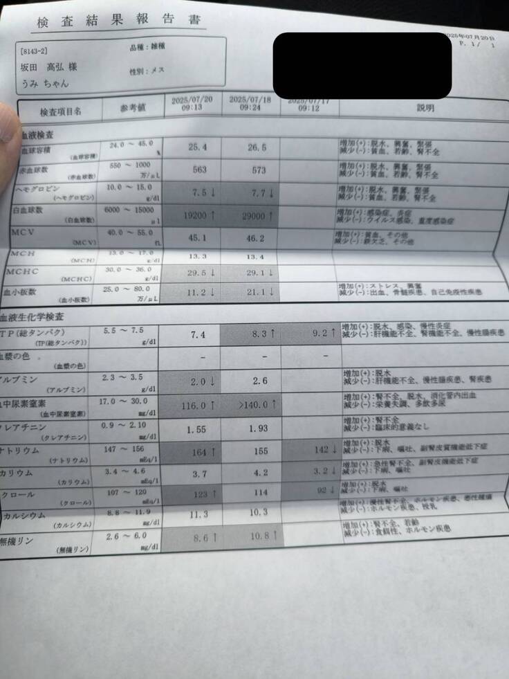 生望ちゃんは血中尿素窒素という、本来ならおしっこで出ていく毒素が、腎不全だったり脱水だったり様々な理由で排出出来ずに体に溜まっている状態でこの数値がかなり高くなっています。