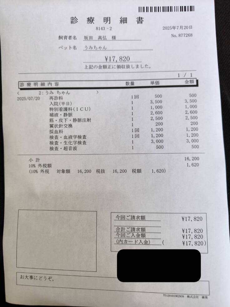 これは生望ちゃんに最近の急激な体調の変化があったことや、小腸が詰まっていたために水分が上手に吸収出来ずに脱水気味だったことが原因だそうです。
