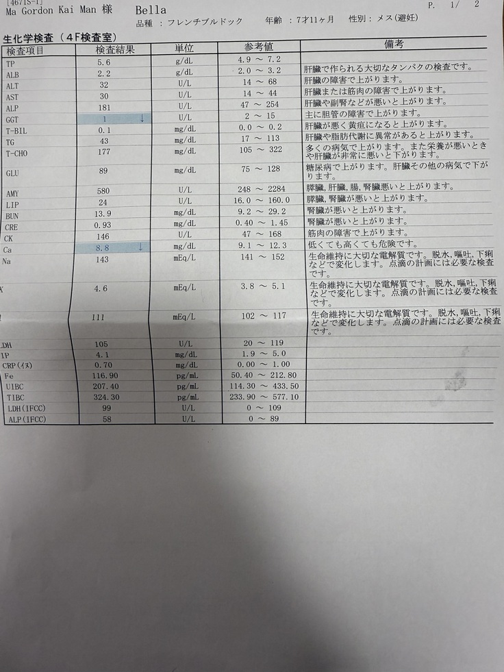 放射線治療の一環として行ったベラの血液検査。細かい数値の意味は分からない部分もありますが、先生から「すべて基準値内で問題なし」とのお話をいただきました。治療の負担がある中でも、体はしっかり頑張ってくれているようで、とても嬉しいニュースです。