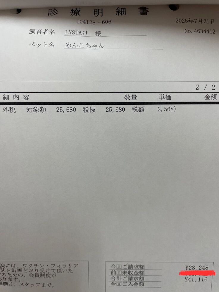 しかし「何か別の原因があるはずだ」と思い、▼こっちのかかりつけAに行き、「これはFIPじゃないのか」となったときの明細です。