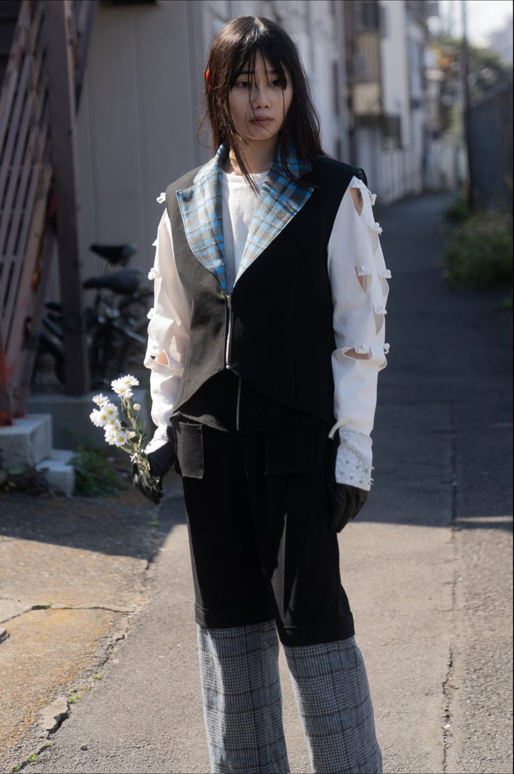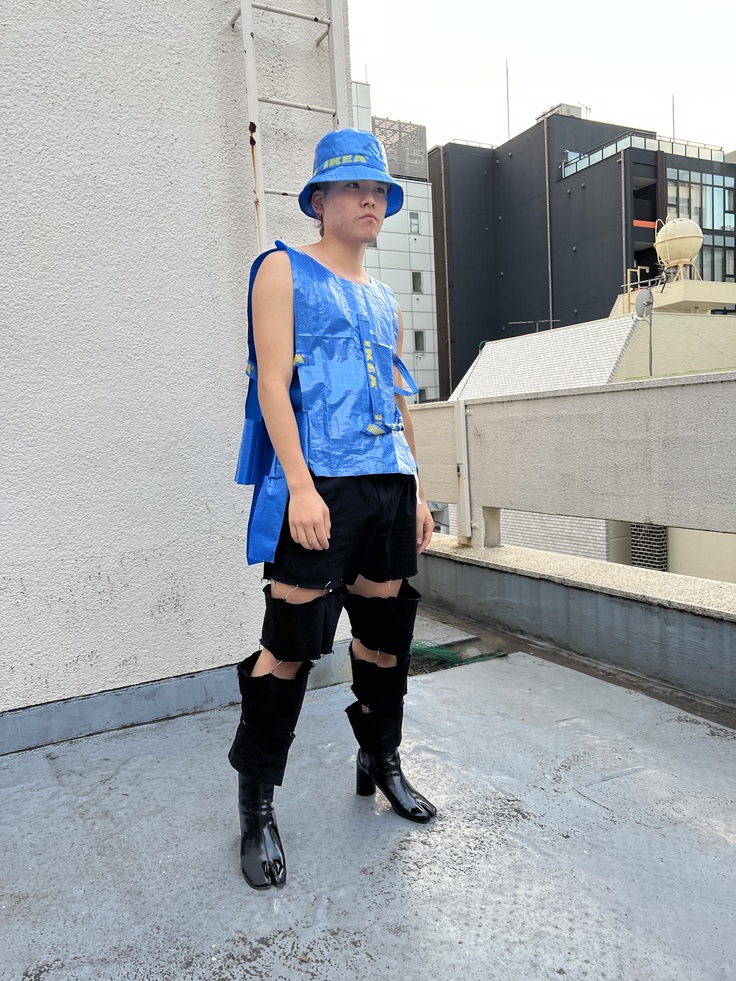 山口県出身で高校卒業後、巣鴨にある東京服飾専門学校へ入学する為に上京しました。ファッションビジネス科で入学しましたが、だんだんと服を作りたい気持ちが高まったので母に無理を言って学科をファッションビジネス科からデザイナー科へ変更させてもらいました。なので、1年生を2年間しています。ファッションビジネス科の頃は服が全く作れないので、リメイクから始めました。パンツとパンツをワイヤーで止めたり、高校の体操服に保冷バッグを縫いつけたり、IKEAのバッグを服にしていました。当時はファッションの知識もほぼ0だったので、偽物の足袋ブーツを履いています。マルジェラも知りませんでした。