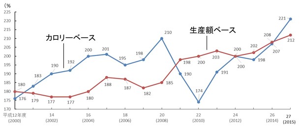 <北海道の食料自給率の推移>