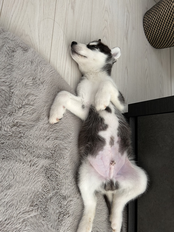 寝る時は大体へそ天で、お腹を触るとすぐにへそ天、無防備な姿がとても可愛いです!