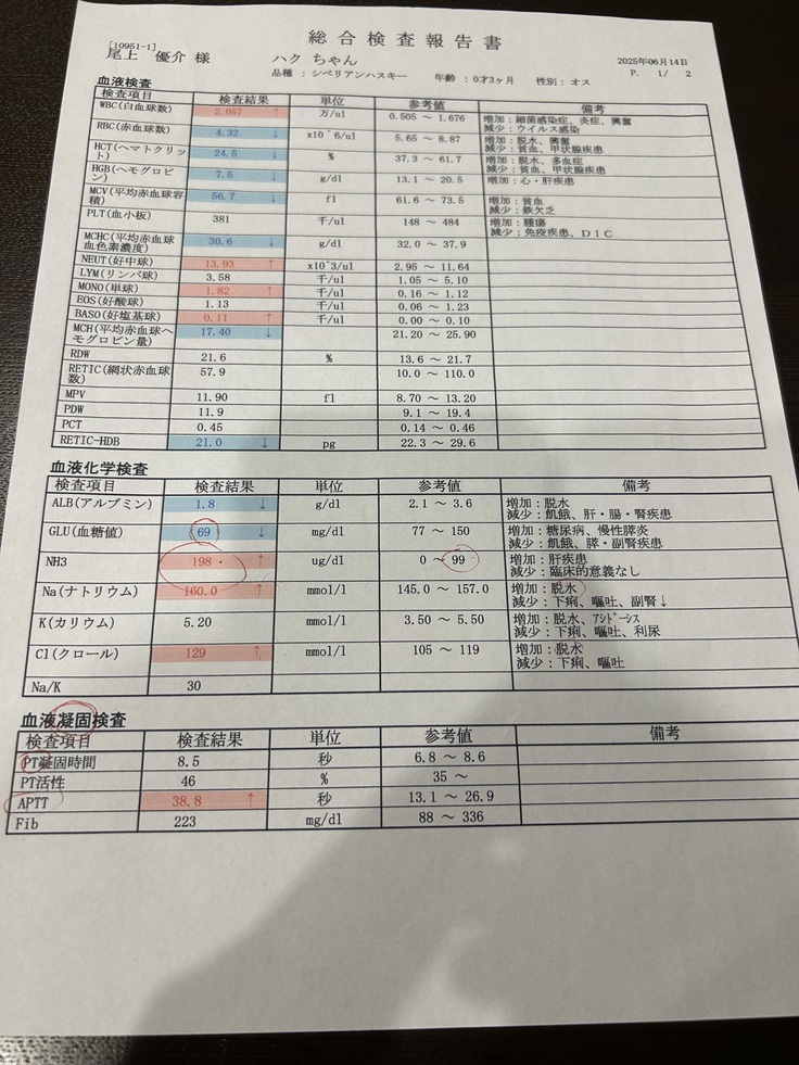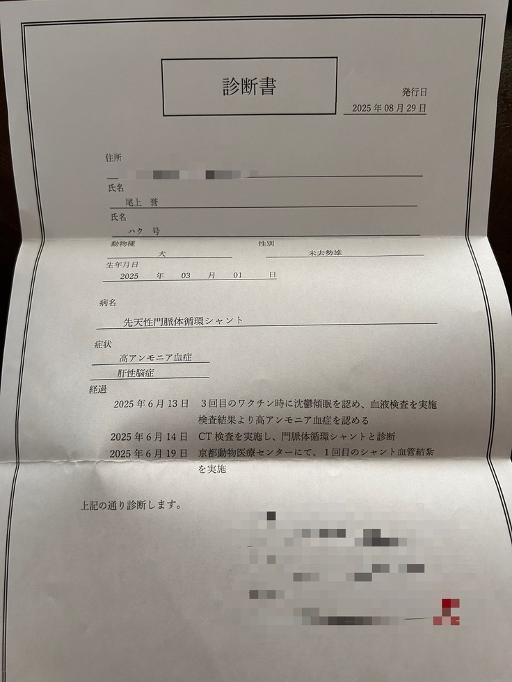 獣医師の先生から早急に手術が必要とお話していただき、命に代えられないのですぐにお願いしました。運よく専門の獣医師の先生の日程が合ったこともあり6月19日にシャント血管閉鎖術を実施していただけました。術後病院に入院し、貧血の改善・食前のアンモニアの改善が認められました(入院期間は6月19日~6月25日)