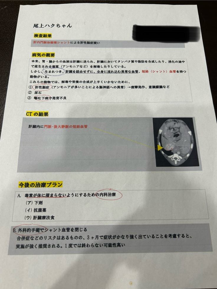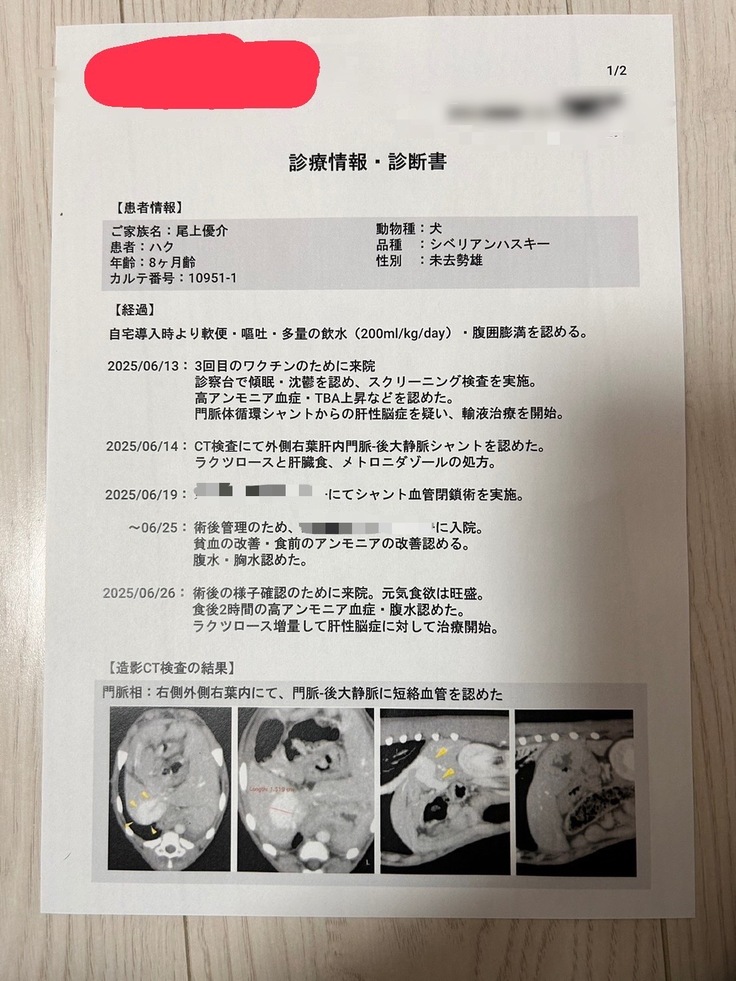 6月13日に3回目のワクチンで病院に行ったらワクチン前の身体検査で熱が39,3度やずっと体調が安定していないこともあり血液検査を先生に勧められ血液検査を行った結果、高アンモニア血症・総胆汁酸(TBA )上昇が見られたため門脈体循環シャントからの肝性脳症の疑いという診断となりました。すぐに輸液治療を開始し、翌日もさらに精密にCT検査を行い最終的に外側右葉肝内門脈シャントと診断となってしまいました。