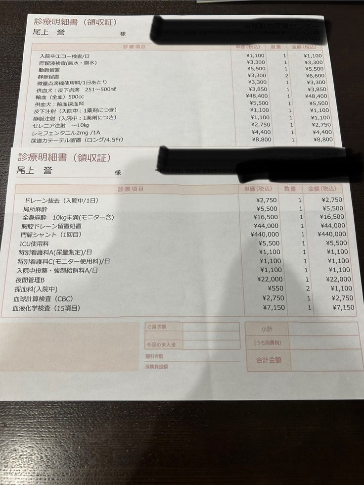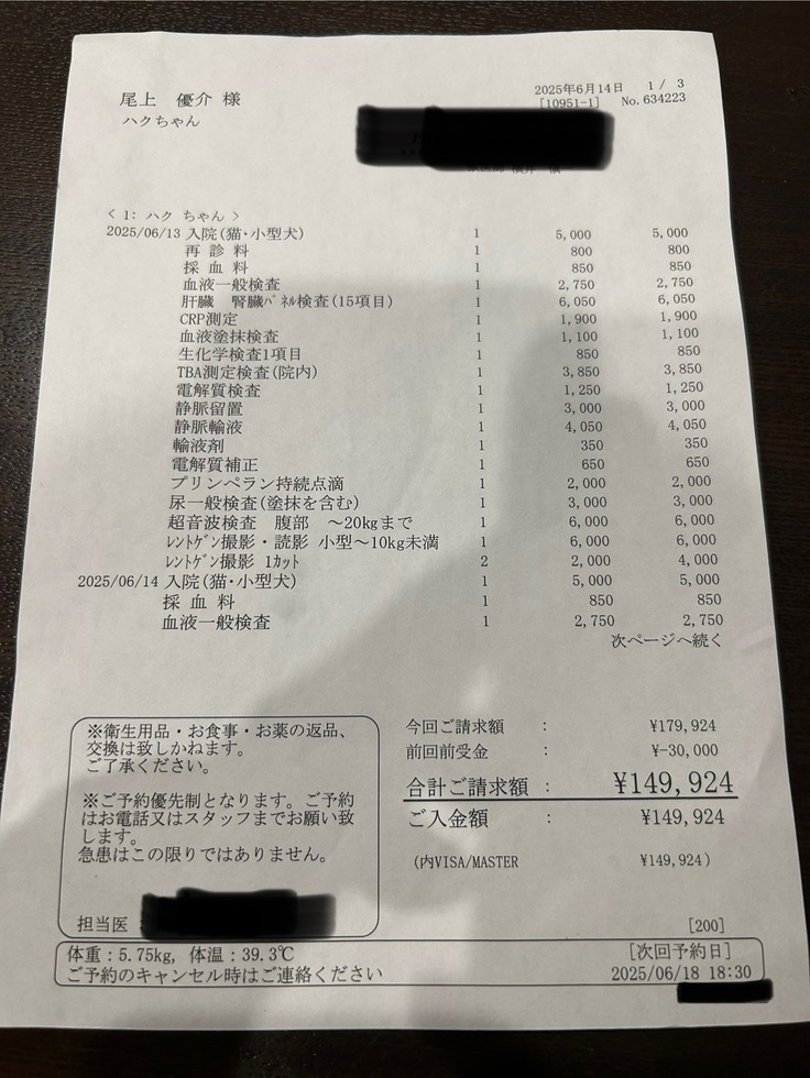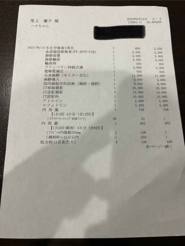 当初、手術費は60万円ほどと聞いていましたが、ハクが成長したことにより、入院費の増額や手術中の輸血が必要となり、60万円では手術ができなくなってしまいました。