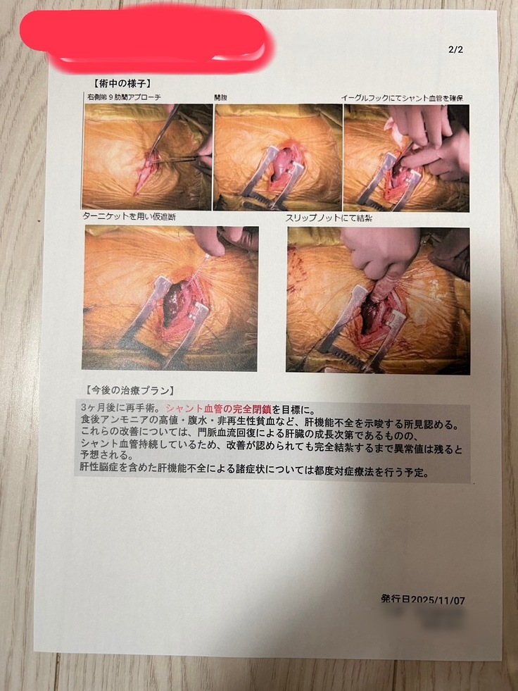 今後の治療として3か月後に再手術を予定しておりシャント血管の完全閉鎖を目標にしていきたいと考えております。