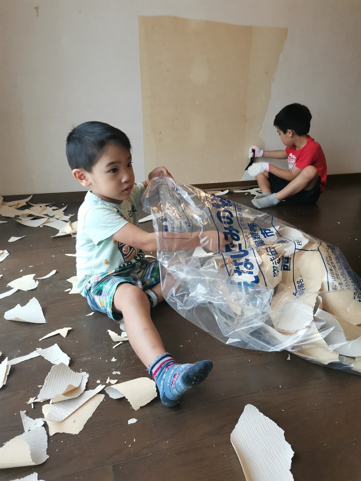 良い壁紙はキレイに大きく剥がせますが、悪い壁紙は剥がし難く、直ぐ破れるので細切れに。。。