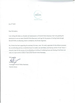 集められた資金は1.Nairobi Feline Sanctuary (ナイロビ猫サンクチュアリ)が現在建設中の母猫と子猫のためのシェルターの建設を完成させ母猫達が安心して子猫を育てられるようする。2.すでに完成している猫シェルターの保護猫達が新鮮な空気を吸って日光浴が出来るための庭のフェンスを完了させる。