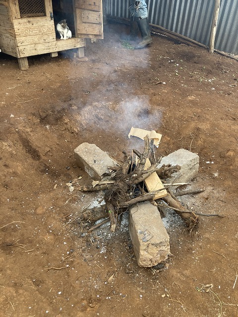移転先で保護された母子猫のための簡易小屋(左)寒い日は小屋の前で焚火をして猫が暖を取る(右)