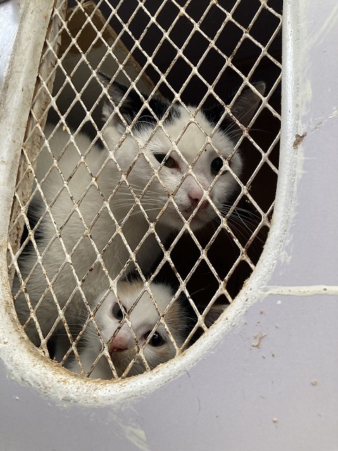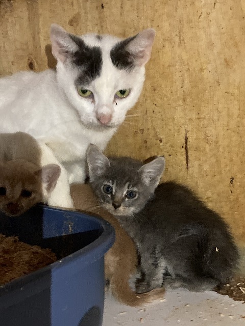 NFSの母・子猫、専用のスペースがないので狭いブースや簡易小屋で保護されています