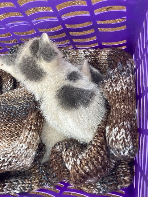 子猫の部屋にいたとても人懐っこいオス猫。飼い主が引っ越した際に置き去りされて保護されてきた(左)母親が亡くなって保護された2匹子猫の兄弟、下にいる弱っている子猫は治療を受けたが翌日なくなった(右)