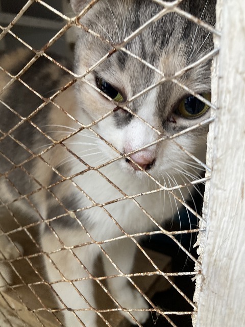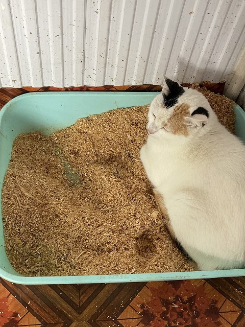 保護されてから数日間は健康状態をみるため狭いケージで隔離される(左)この子育て中の母猫は他の猫となじめずトイレが安心するスペース(右)