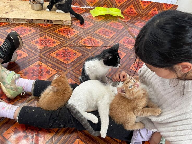 チュールをあげたり、おもちゃで遊んだりするうちに、床に座り込んだ子どもたちの膝や肩に子猫が次々とやって来て、膝の上でうとうとする子もいました。子どもたちは子猫とたくさん触れ合うことができ、とても癒やされる時間でした。