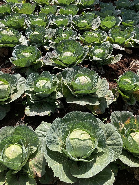 NFSの菜園ではキャベツが育っている。保護ネコたち、外で日向ぼっこ中、プロジェクトではこの外のエリアを広げる予定。