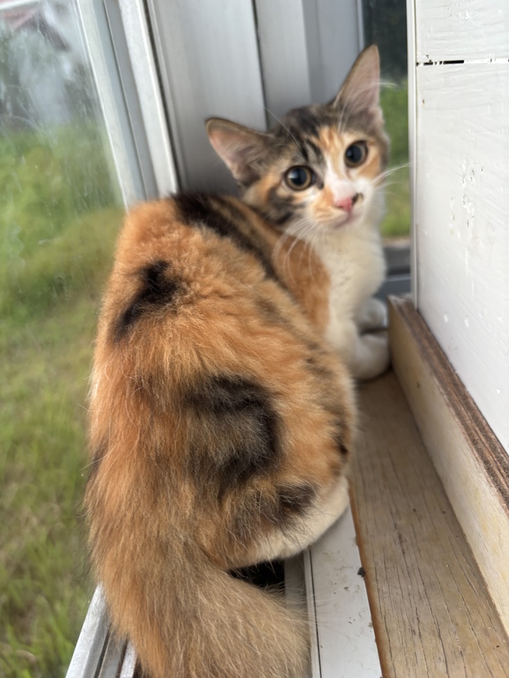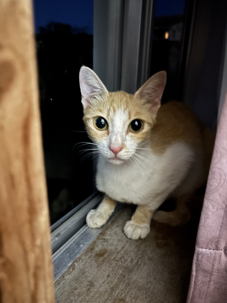 (名前を付けました。保護された事に不服なお母さんのチャー、外を見て鳴いています)
