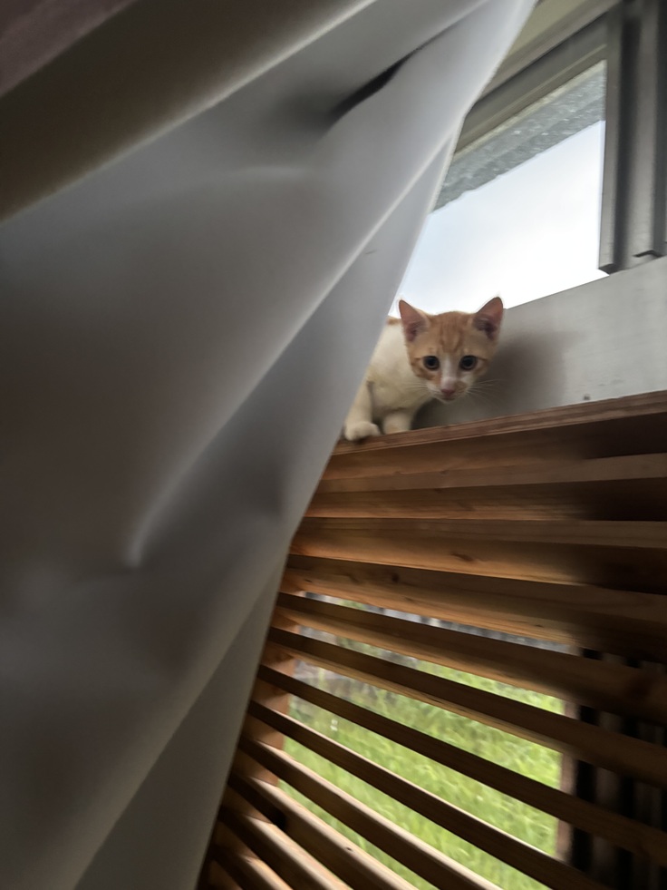 (好奇心と怖さのせめぎ合い中の兄弟猫ミッケ)