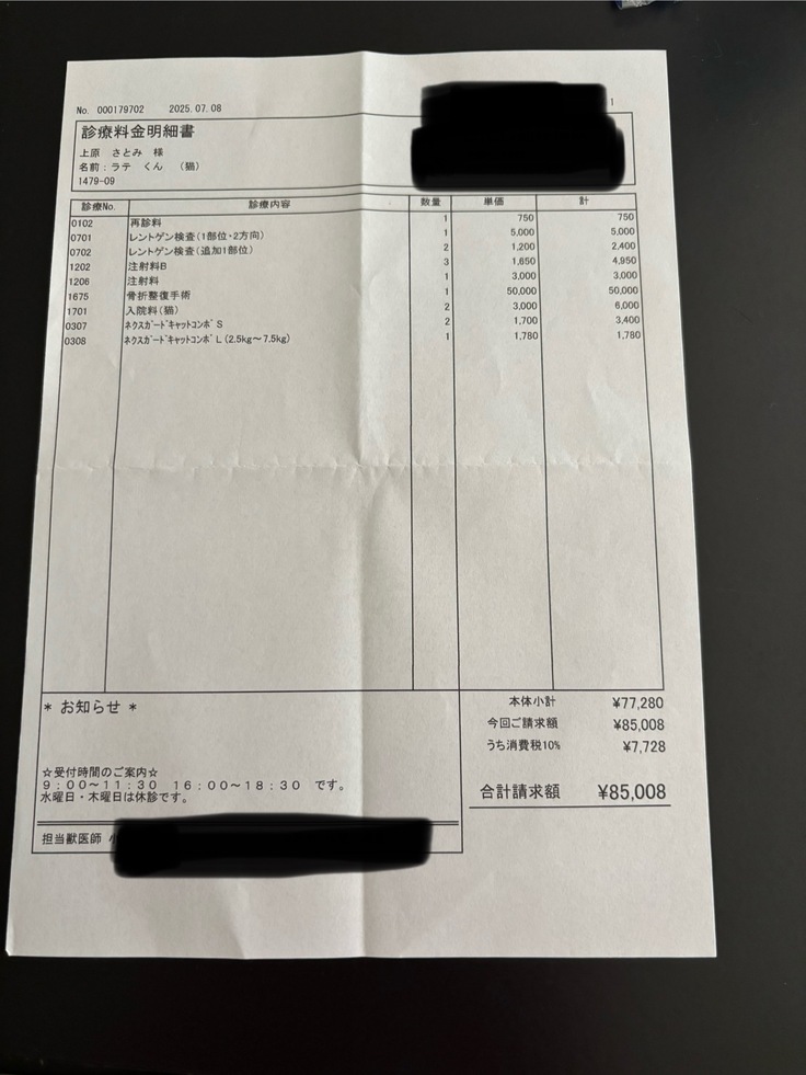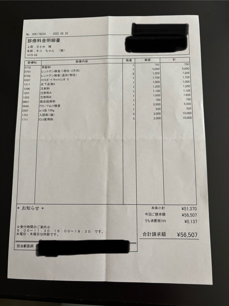 (最初の入院。保護して間もない時で名前がなかったので「ネコちゃん」となっていますが、「ラテ」の診療料金です)