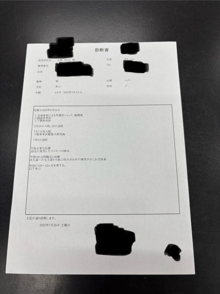 手術では子猫なので骨が細いうえに下顎の3箇所の骨折、更には砕けている所もあり、元のようにはいかなかったのですが術後、半開きだった口は閉じる事出来ていますし、永久歯が生え揃った際に噛み合わせをみて頂く事になっています。