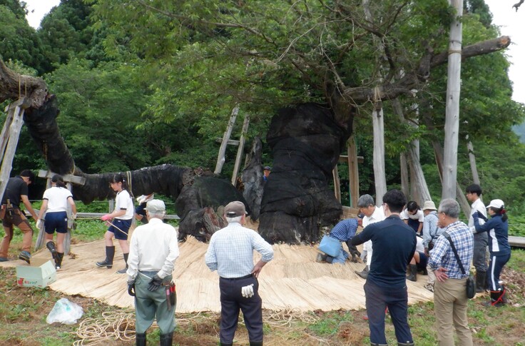今後は、このプロジェクトのような大きな樹勢回復作業は行わず、今も懸命に生きる若い枝の生きる力に期待し、またかつての大きな姿に育つようそっと手を差し伸べ、地域全体で見守り続けていきたいと考えています。これからの成長や確実な保護管理を第一に考えた場合、枯死した枝を全て剪定することも検討しました。しかし、見るの人の心に強く根付き、朽ちかけてもなお雄大に咲き誇っていた当時の姿を感じられる今の伊佐沢の久保ザクラを、可能な限り現在の状態で保存し、活用することで次の世代へ伝えていきたい所存です。皆さまからの温かいご支援をどうぞよろしくお願いします。