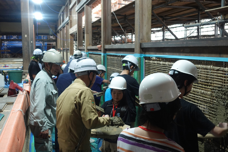 本堂では、次代を担う子どもたちに伝統の技を体感してもらおうと「土壁塗り体験」を実施しました。解体の際に取り外した当時の土壁は大切に保存され、藁を加えて練り込み、発酵させた荒壁用の土が再び活用されています。