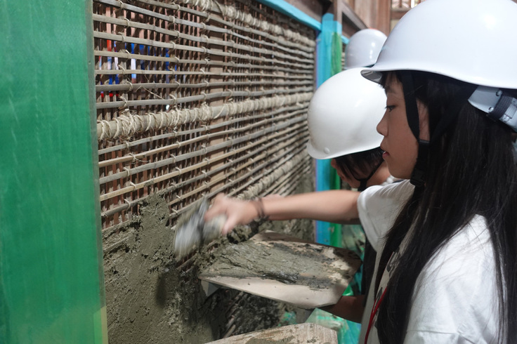 不慣れな手つきながら、左官職人の指導を受けながら一生懸命に土を塗る姿は、伝統を受け継ぐ尊さを体感しているようで、とても頼もしく映りました。先人たちが残した技術に触れ、楽しそうに取り組む子どもたちの姿に、未来への希望を感じたひとときでした。