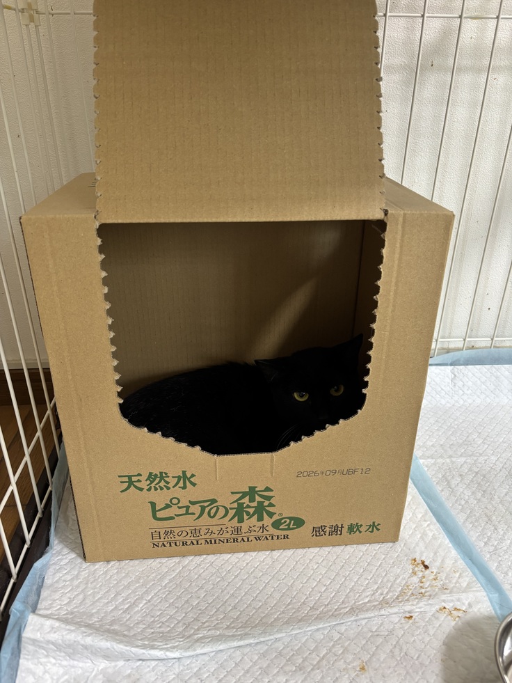 隣の部屋は暑いので空箱ごとゲージに入ってもらいました。
