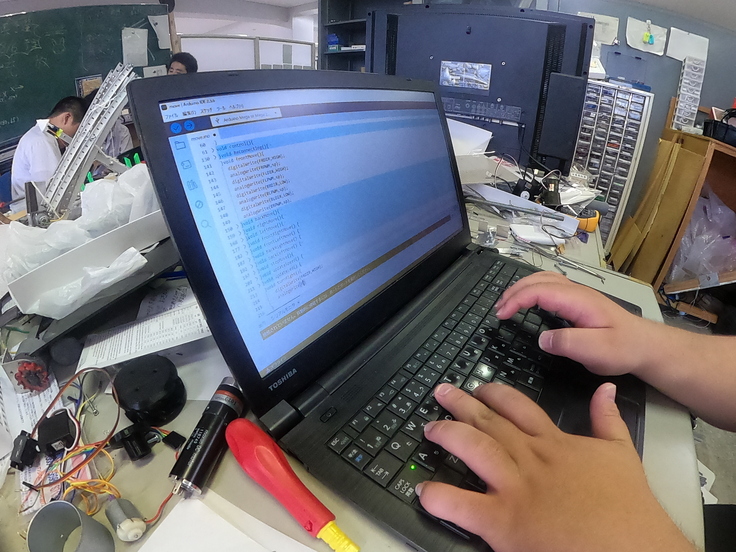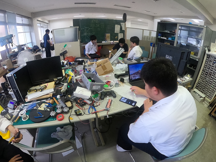 全国ロボット競技大会を目指して放課後遅くまで議論し、時にはうまく動かない回路に頭を悩ませながらも、部員どうしで教え合い、学び合いながら少しずつ前へ進んでいます。