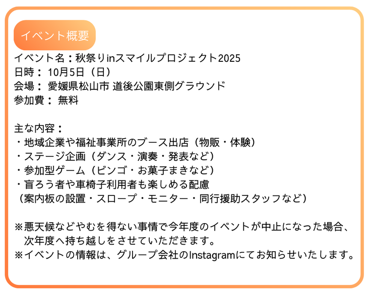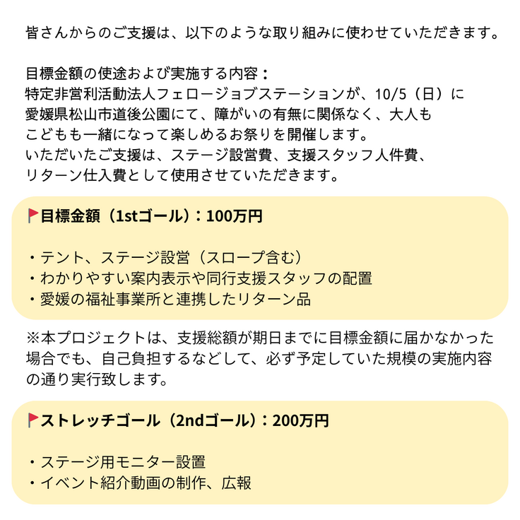 特定非営利活動法人フェロージョブステーションが、10/5(日)に愛媛県松山市道後公園にて、障がいの有無に関係なく、⼤⼈もこどもも⼀緒になって楽しめるお祭りを開催する。いただいたご支援は、ステージ設営費用、案内表示設置費用、支援スタッフ人件費、リターン仕入費として使用する。