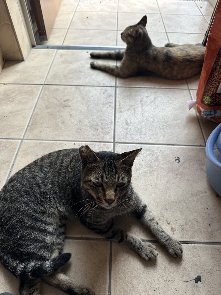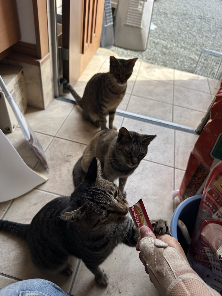 お外の倉庫(まだ改装してないですが)でお世話している7匹のうちの兄妹、私が出かけて帰ってくると走り寄ってきます