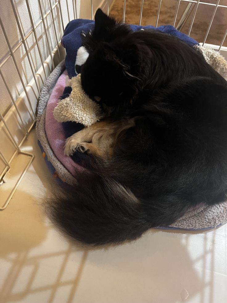 疲れてしまったのか…9時には自らハウスに入って休んでいます。最近雷が多くて、ワンちゃんは雷苦手だとおもうので、かわいそうです😢心臓になるべく負担をかけないように手術まで生活したいのですが…