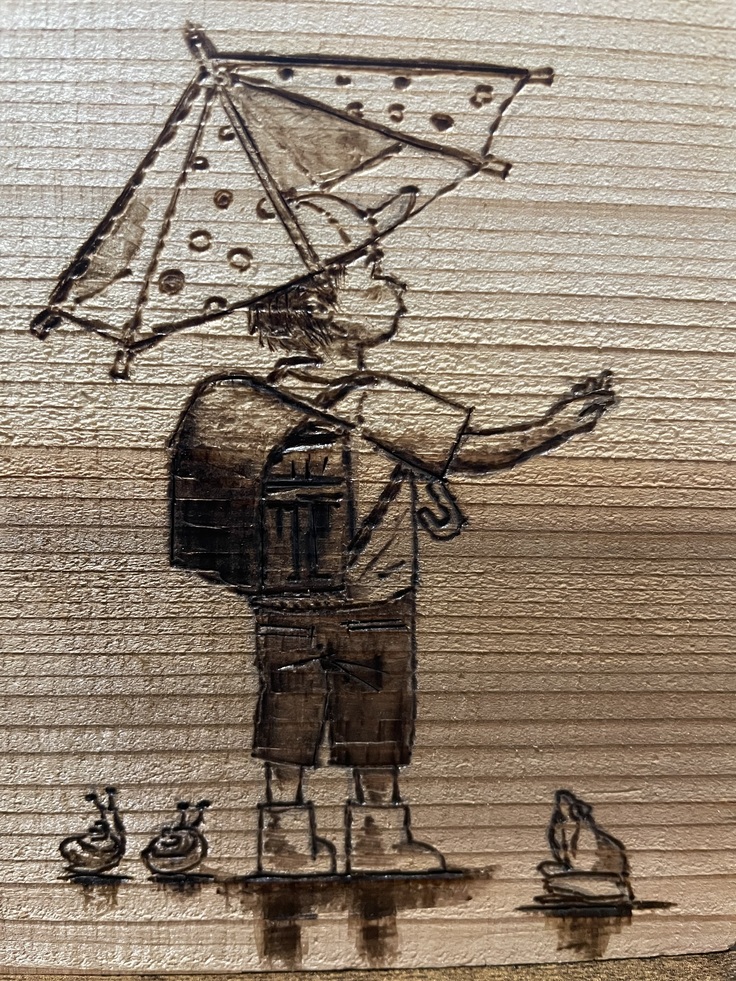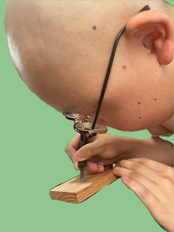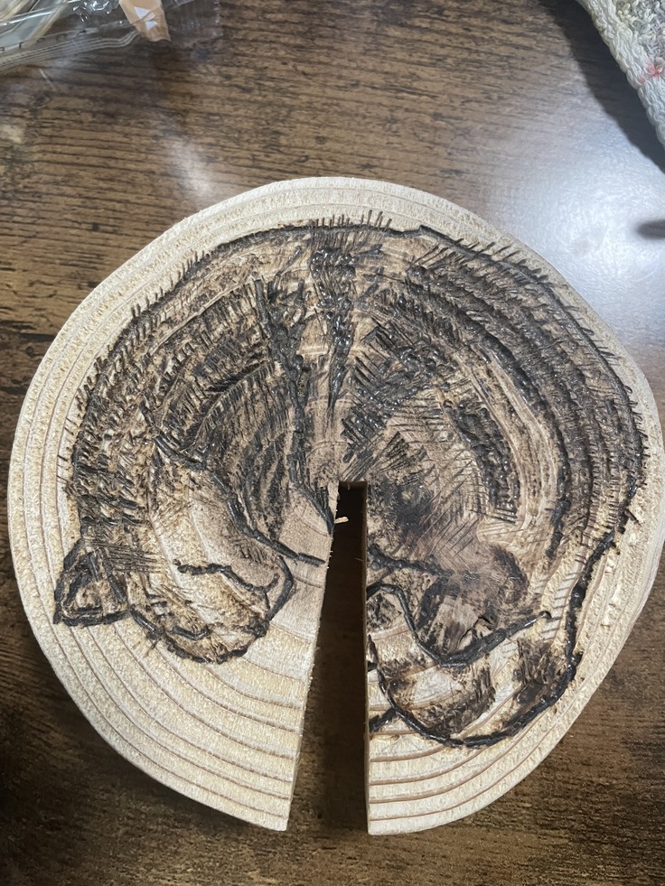 岳流と私の共作でウッドバーニングの作品を作成中。