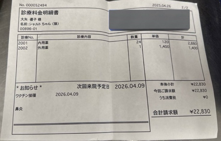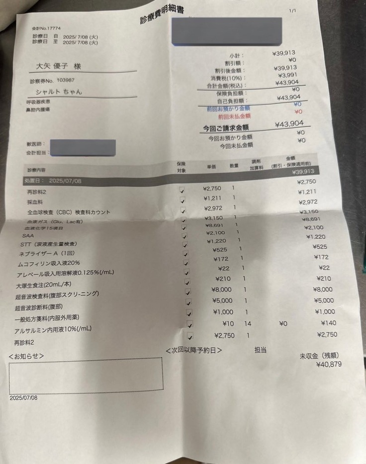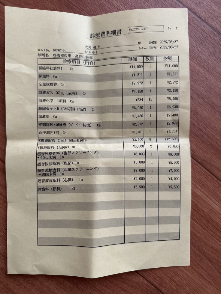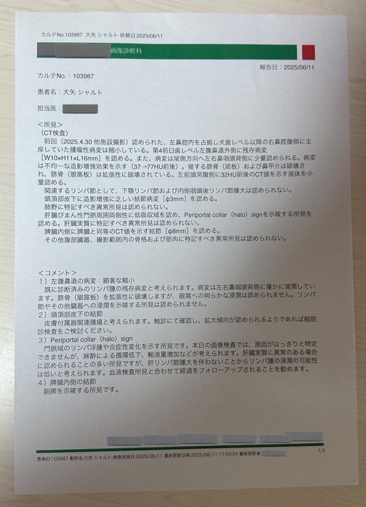 先生からもしかしたら鼻の見えない所に腫瘍があって、それが原因である可能性があると言われました。入院のストレスもあるので今回は経過観察になりました。体調が落ち着いたら、全身麻酔をしてCTを撮り、腫瘍がないか検査機関に送って調べてもらう事になりました。