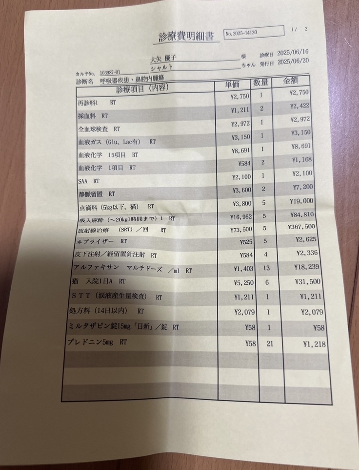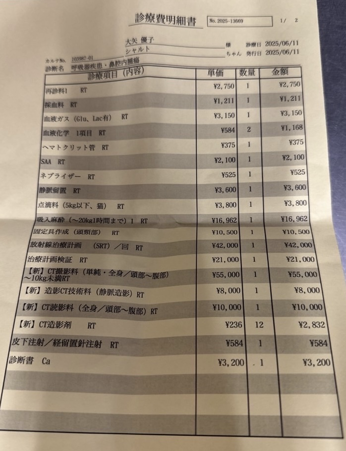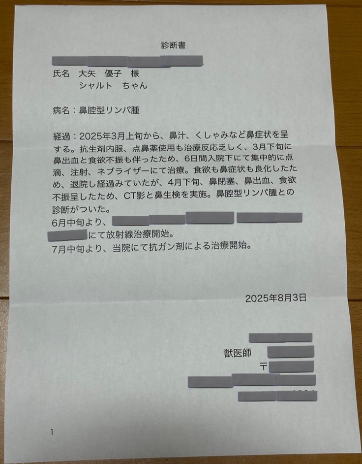 シャルトの現在治療中である鼻腔内リンパ腫の抗がん剤治療の今までと今後の治療費にあてます。