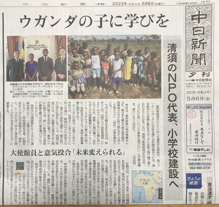 五条クラブ理事長がファウンダーであるウガンダのKOMOREBI小学校を完成させるため資金は学校づくりにしようする