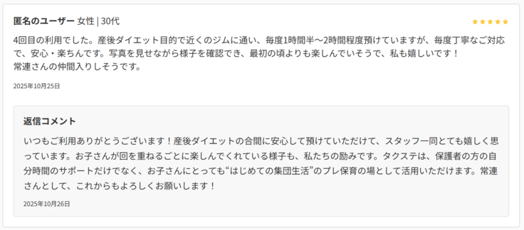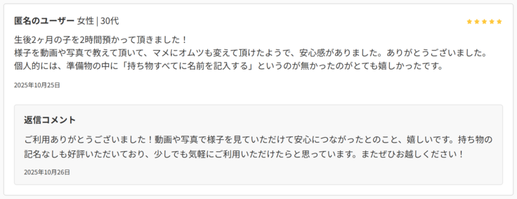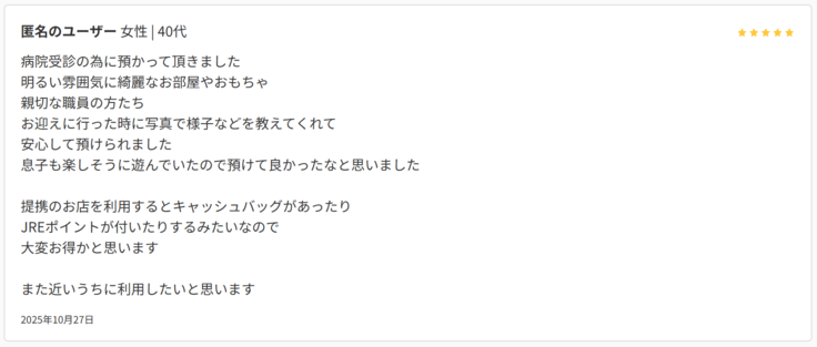 オープンから二週間が経過しました!日々多くの子育て世帯の方へご利用いただくことができ、とても嬉しく思います。また、ご利用いただいた皆さまからもありがたいお言葉やリフレッシュができたとのお声を多くいただいており感謝申し上げます!