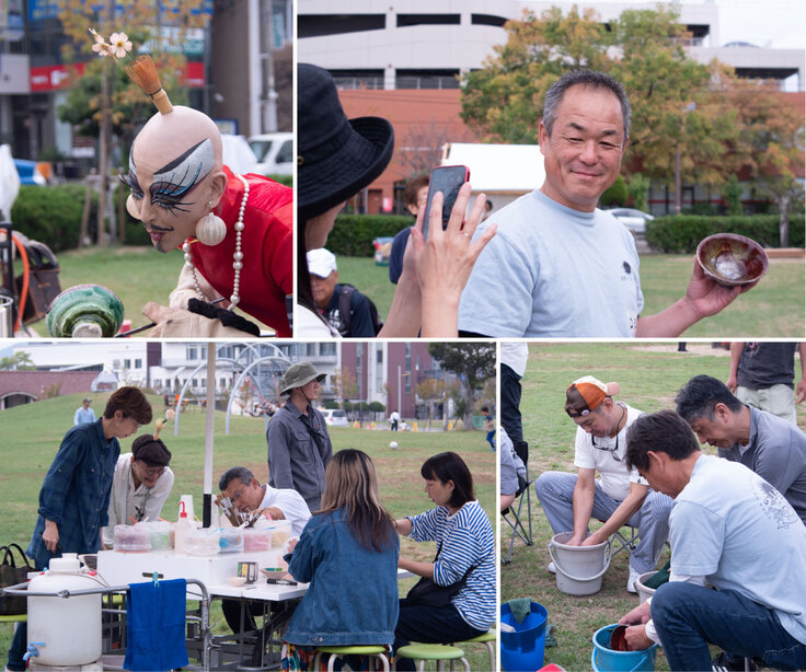 素焼きの茶碗、陶芸窯、お茶道具一式を積んだリヤカーで全国各地を周るじんじんさんの野点。