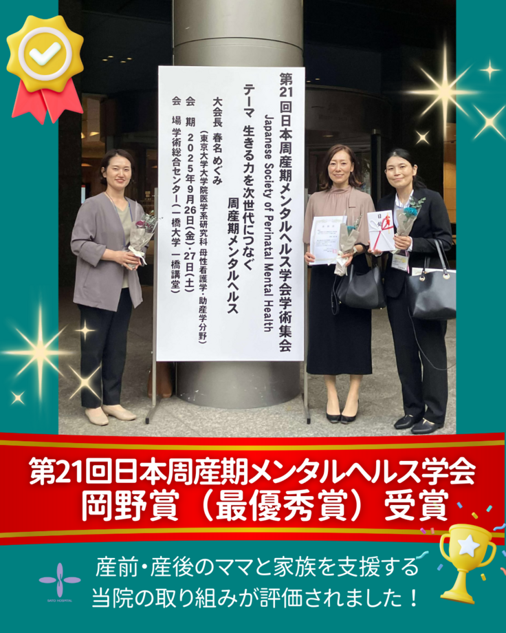 9月26・27日に開催された「第21回日本周産期メンタルヘルス学会」にて、当院における母子支援の段階的な取り組みと、訪問看護ステーション「コトイサ」を通じた地域母子支援の展望を発表し、栄えある岡野賞(最優秀賞)を受賞いたしました。学会を通じて、私たちの取り組みを全国へ発信できたこと、そして岡野賞(最優秀賞)という最高の評価をいただけたこと、母子支援関係者様からたくさんの温かいお言葉を頂戴したことは、大変大きな自信と励みとなりました。今後も佐藤病院グループでは、訪問看護ステーション「コトイサ」を通じ、地域のご家庭に安心と心地よさを届けてまいります。引き続き、本クラウドファンディングの応援も宜しくお願い致します。