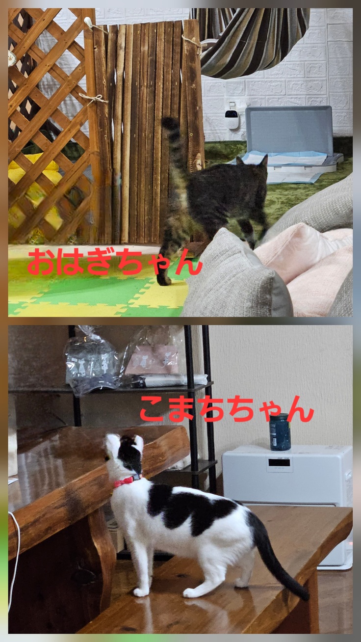 掃除中に、入口を無理やりこじ開けるのはおはぎちゃん、着いて出て行ってしまうのがこまちちゃんです。